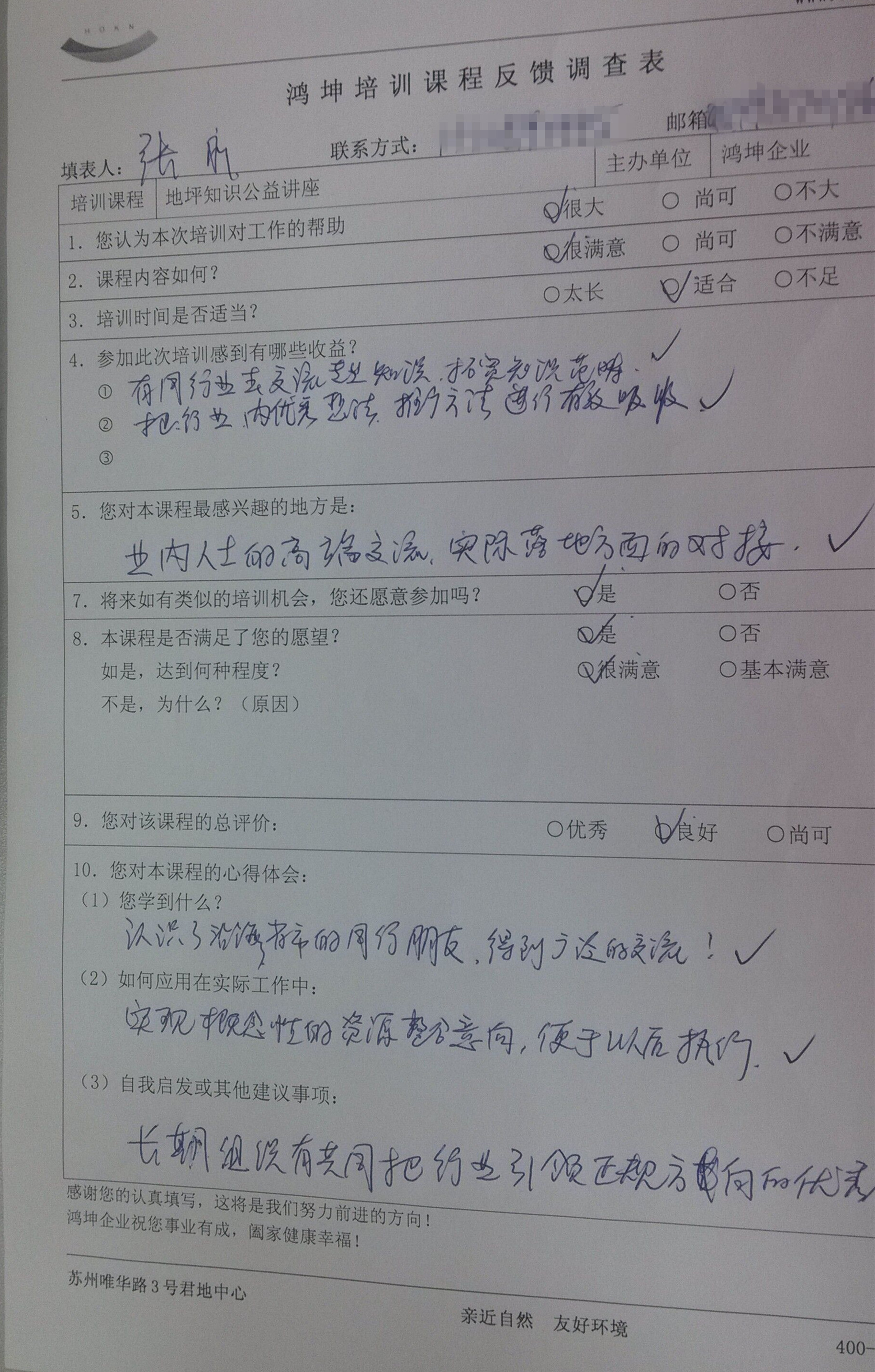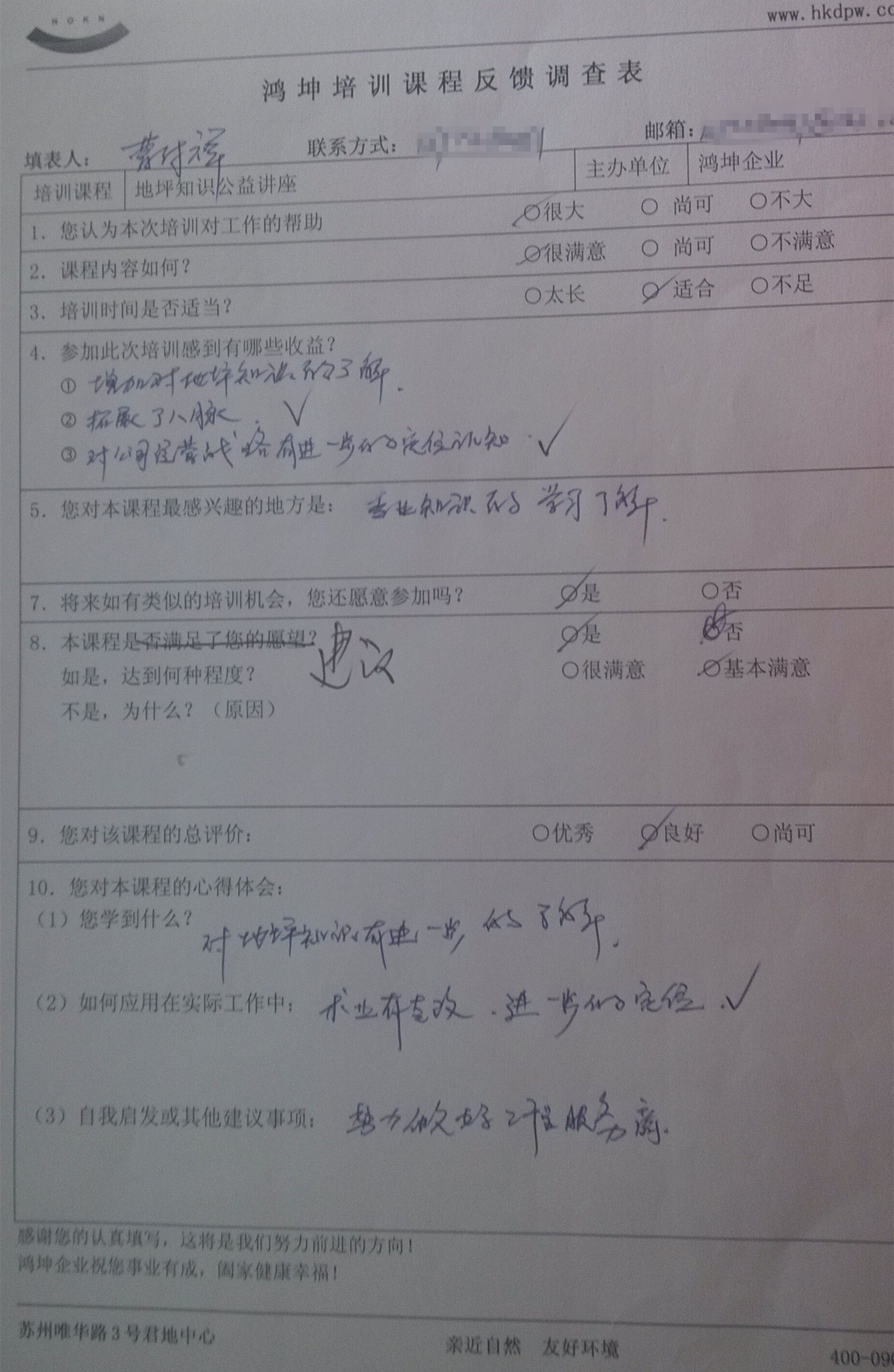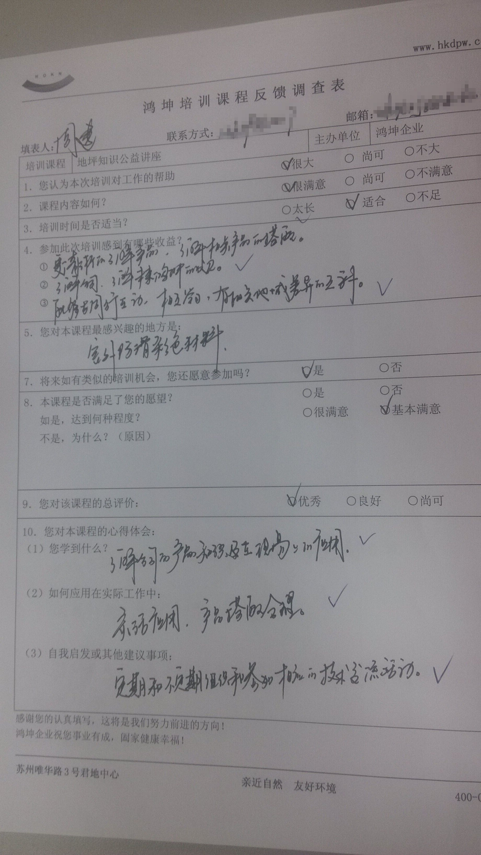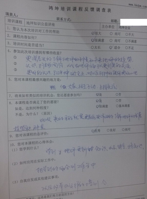 南京林總對于鴻坤企業第三期地坪知識講座認為對工作幫助很大,對我們設置的課程內容很滿意,培訓時間適合。 鴻坤企業:參加此次培訓感到有哪些收益?南京林總:1.產品的特性;