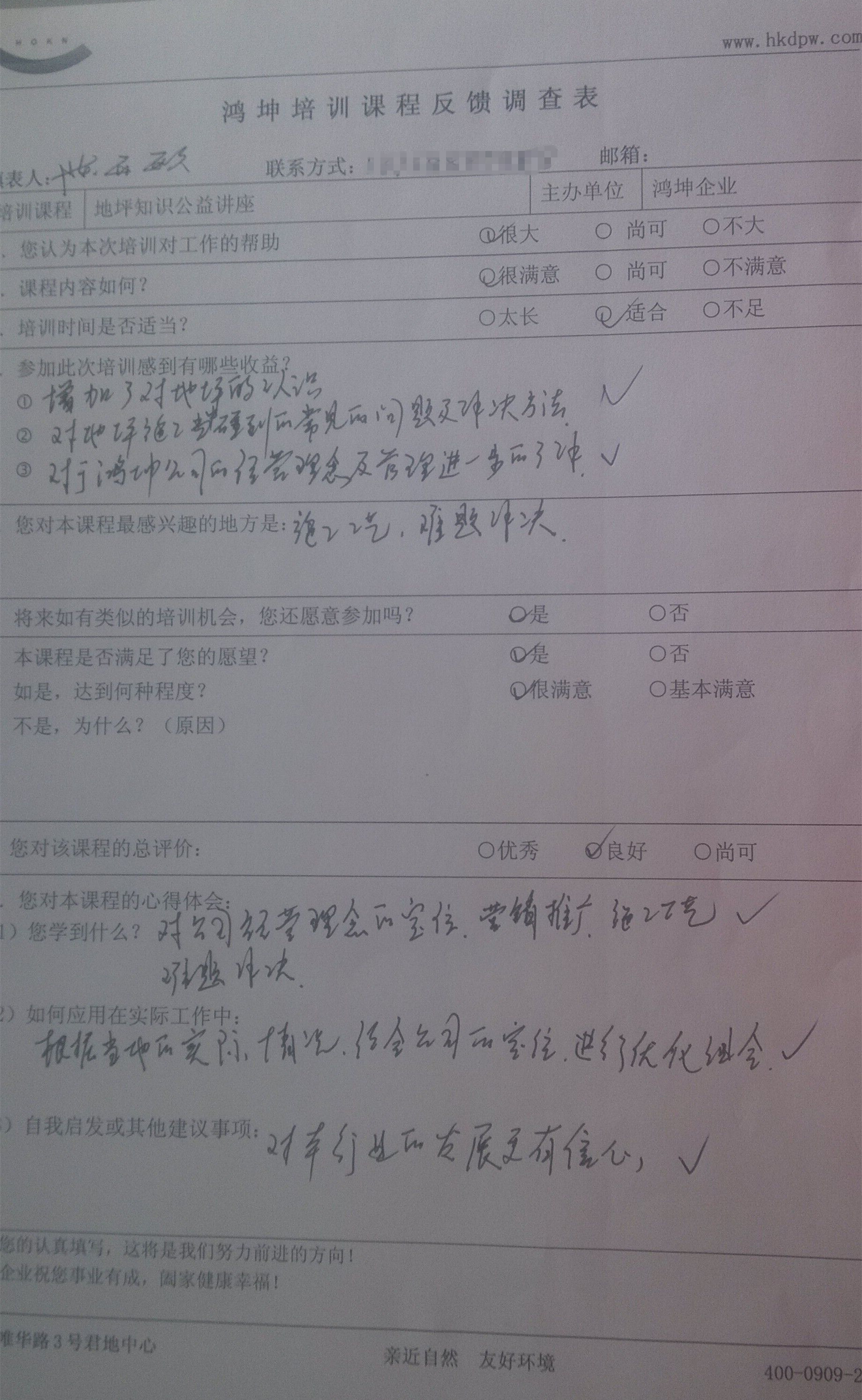 武漢周建總對于鴻坤企業第四期地坪知識講座認為對工作幫助很大,對我們設置的課程內容很滿意,培訓時間適合。鴻坤企業:參加此次培訓感到有哪些收益?武漢周建總:1.更清晰的了解